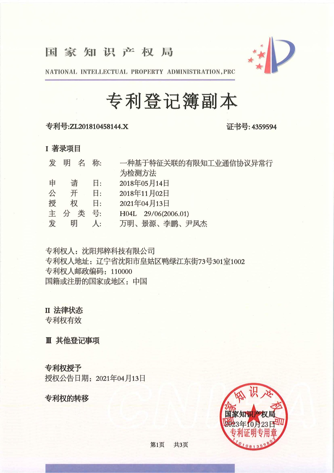 一種基于特征關(guān)聯(lián)的有限知工業(yè)通信協(xié)議異常行為檢測(cè)方法專(zhuān)利證書(shū)